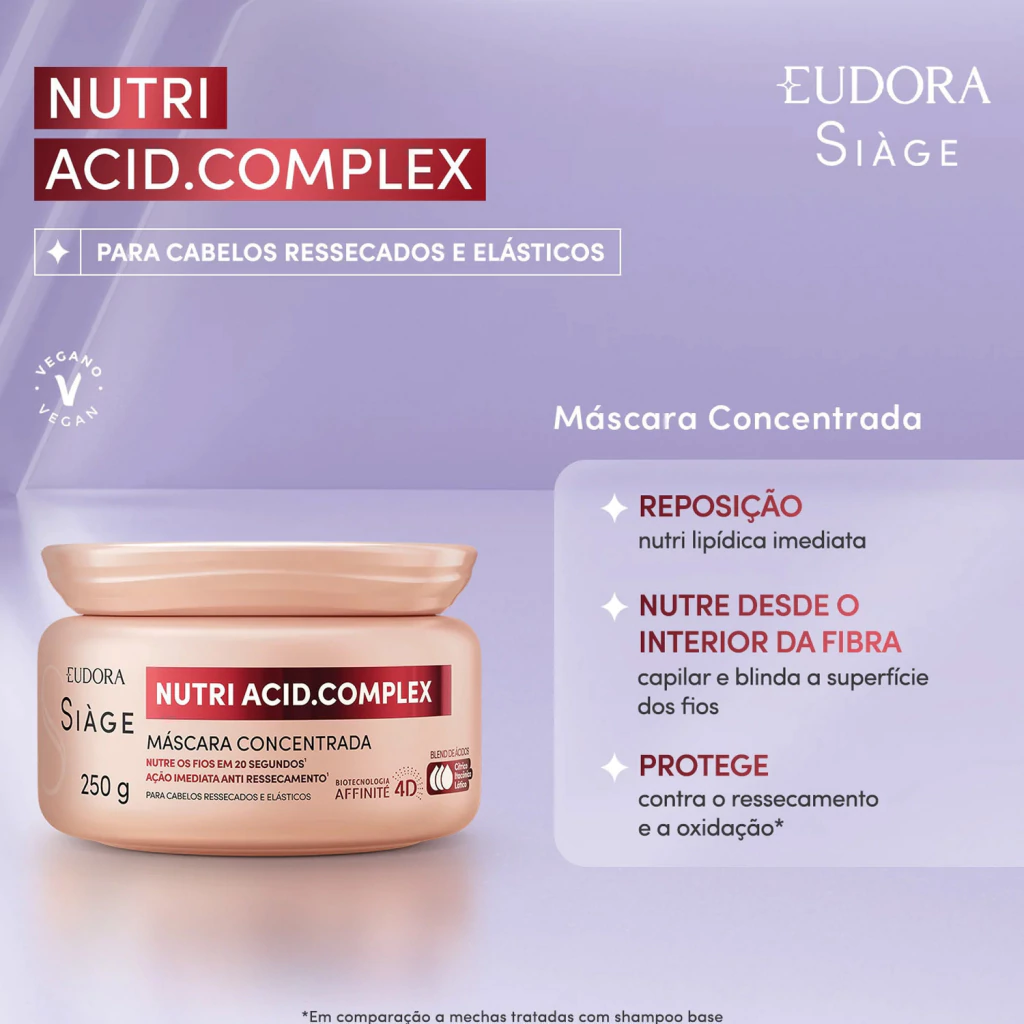 O Combo Siàge Nutri Acid.Complex reúne os quatro produtos essenciais da linha para transformar cabelos danificados em fios nutridos, resistentes e com brilho intenso. Sua fórmula com blend de ácidos e óleos atua profundamente da cutícula ao córtex, promovendo uma regeneração visível desde o primeiro uso.